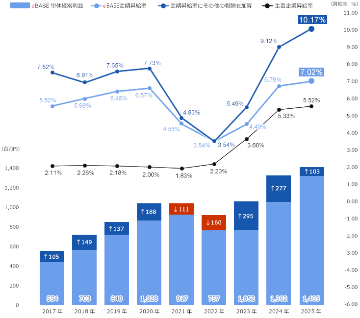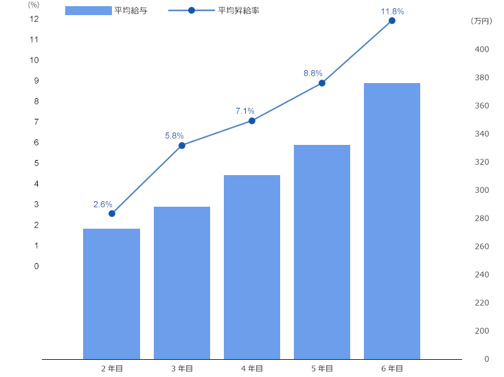 毎年、正社員へ権利貸与された年度から6年後の経常利益の伸び率により報酬が発生し、その報酬を自社株もしくは現金支給で受け取れます。