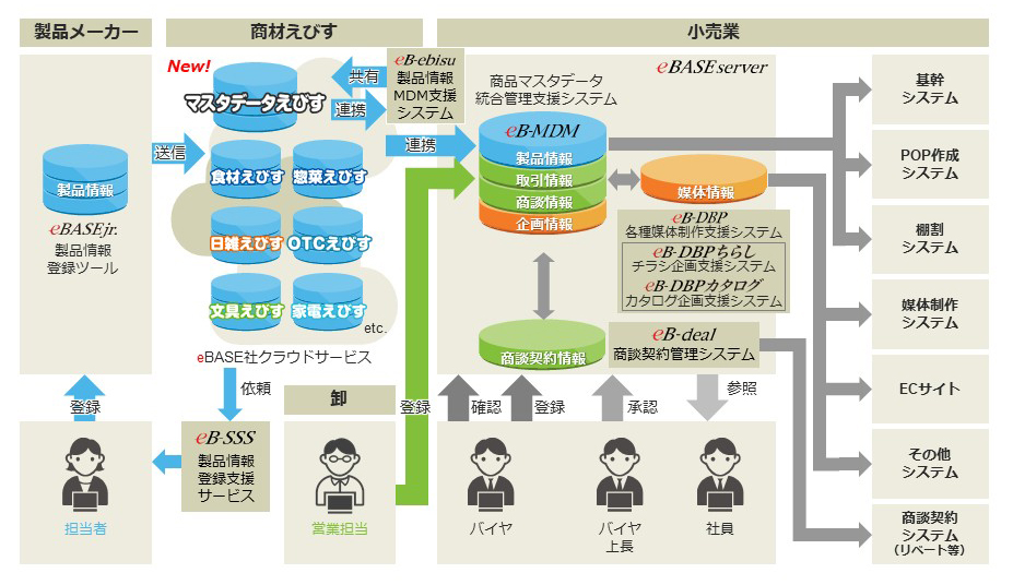 eB-MDMは、製品情報データプールサービス「商材えびす」と連携し、商品マスタ登録に必要な製品情報、商い情報(取引・商談情報等)の一元管理と展開を支援する「商品マスタ登録支援システム」オプションです。