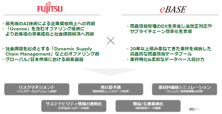 富士通は、企業間電子商取引(EDI)における豊富な実績とサプライチェーンを構成する幅広いソリューションラインナップ、多業種市場での実績とノウハウ、AIをはじめとした最新ICT技術基盤と高い開発能力・サポート体制を強みとしています。一方、eBASEは、流通商品情報交換の多数の導入実績を誇り、品質管理・商品開発の責任者との信頼関係と取引実績、様々な業界の商品情報ビッグデータを所有し、メーカーや小売から最新の情報を収集し続ける仕組みを保有しています。