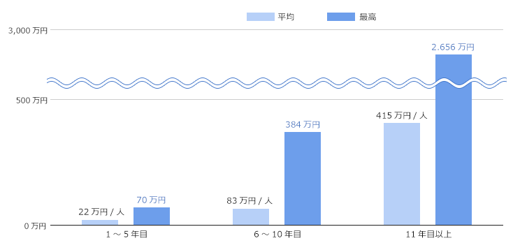 毎年、正社員へ権利貸与された年度から6年後の経常利益の伸び率により報酬が発生し、その報酬を自社株もしくは現金支給で受け取れます。
