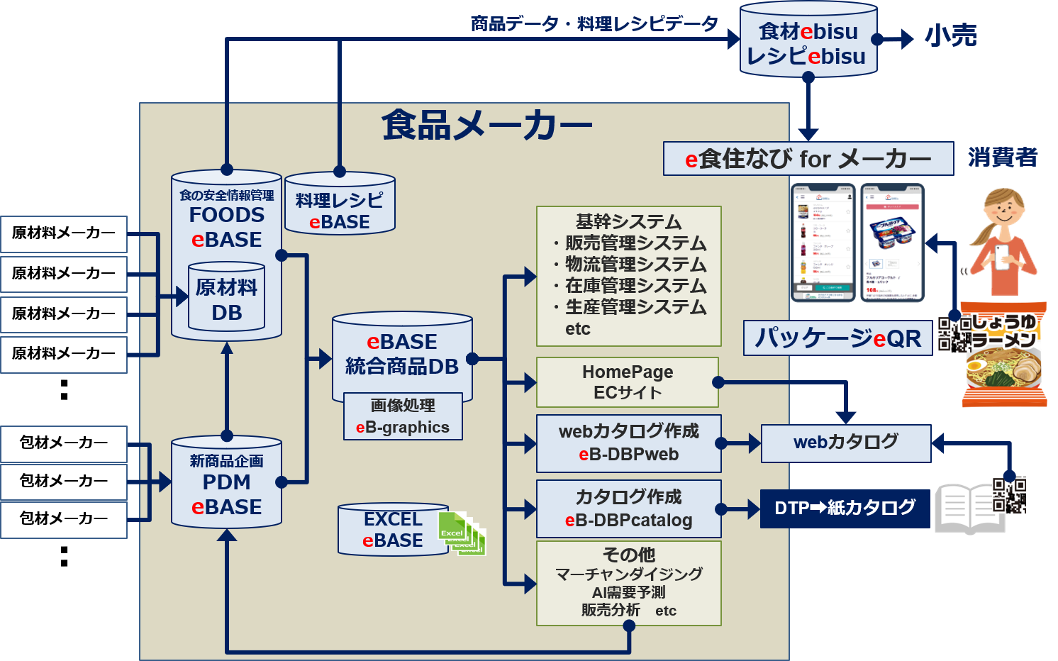 原材料メーカーからの商品情報収集と、食品卸や食品スーパーへのシームレスな商品情報提供機能を有していますので、自社商品の”食の安全安心情報”を必要十分な精度でタイムリーに構築し、かつ、投資対効果の高い運用を可能とするソリューションを提供しています。