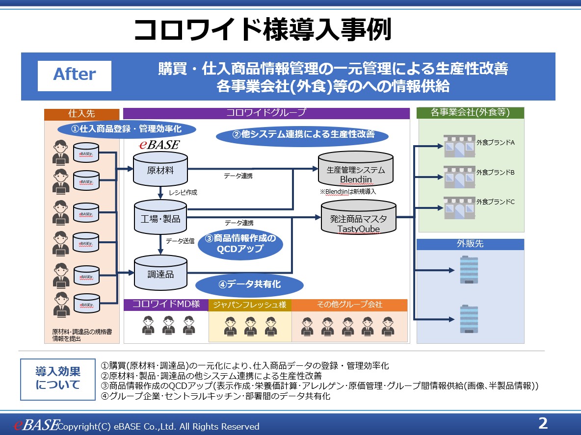 SCM(生産管理)システムに必要な商品、資材・原料の情報を取引先より、eBASEで収集し、マスタメンテナンスの効率化を図ると共に、食の安全・安心管理に向けた品質情報も合わせて管理し、統合商品情報DBを構築。その構築・運用方法と展開をご紹介。